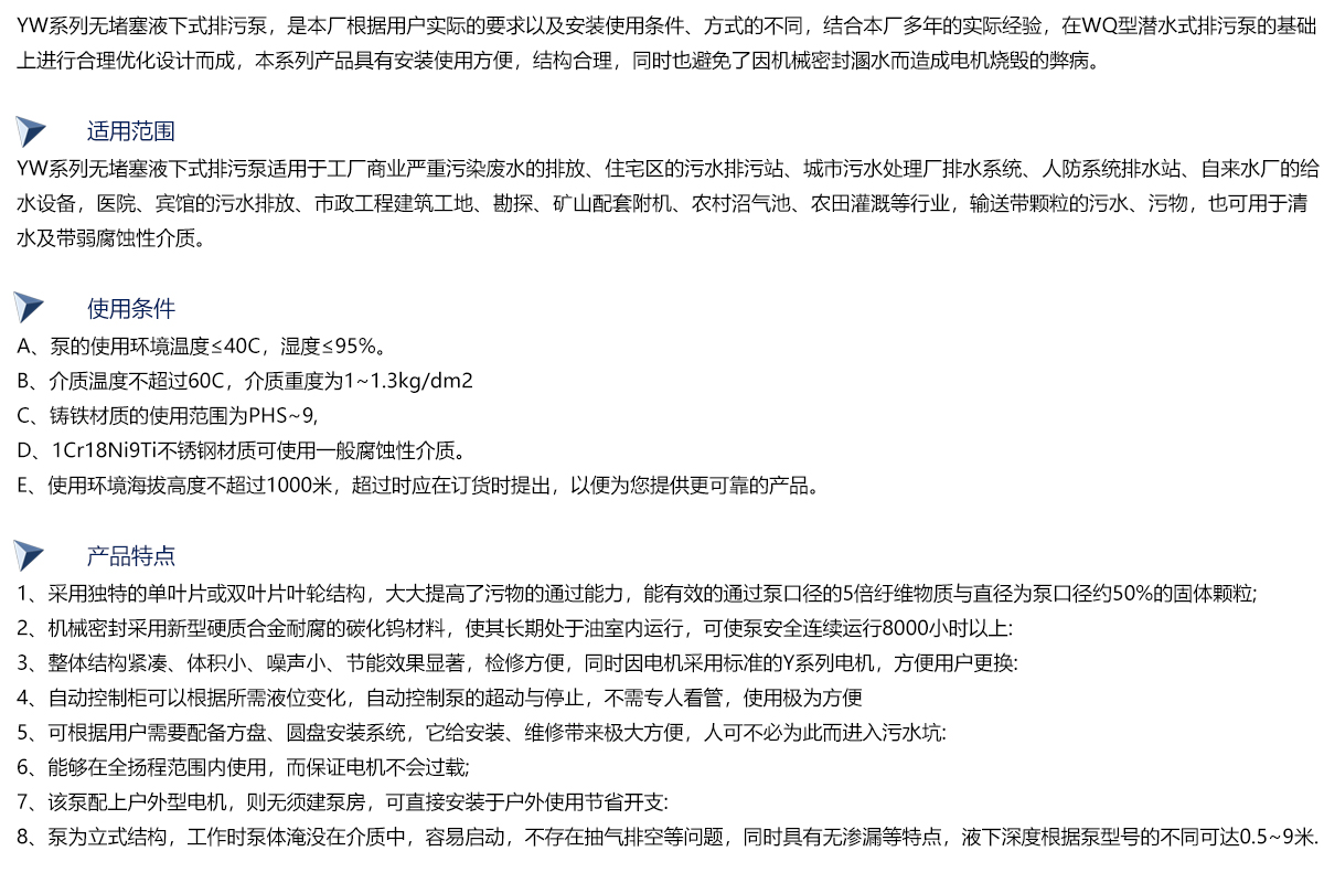 该系列排污泵是引进联邦德国ABS制泵公司先进技术,通过吸收、转化研制而成,各项性能指标均达到国家标准同类产品水平。由于采用独特的单(双)通道叶轮,排污能力强、能有效的通过泵口径的5倍纤维物与直径为泵口径50%的固体颗粒,动密封采用两组特殊材料的硬质合金机械密封装置,材质为铸铁和不锈钢。