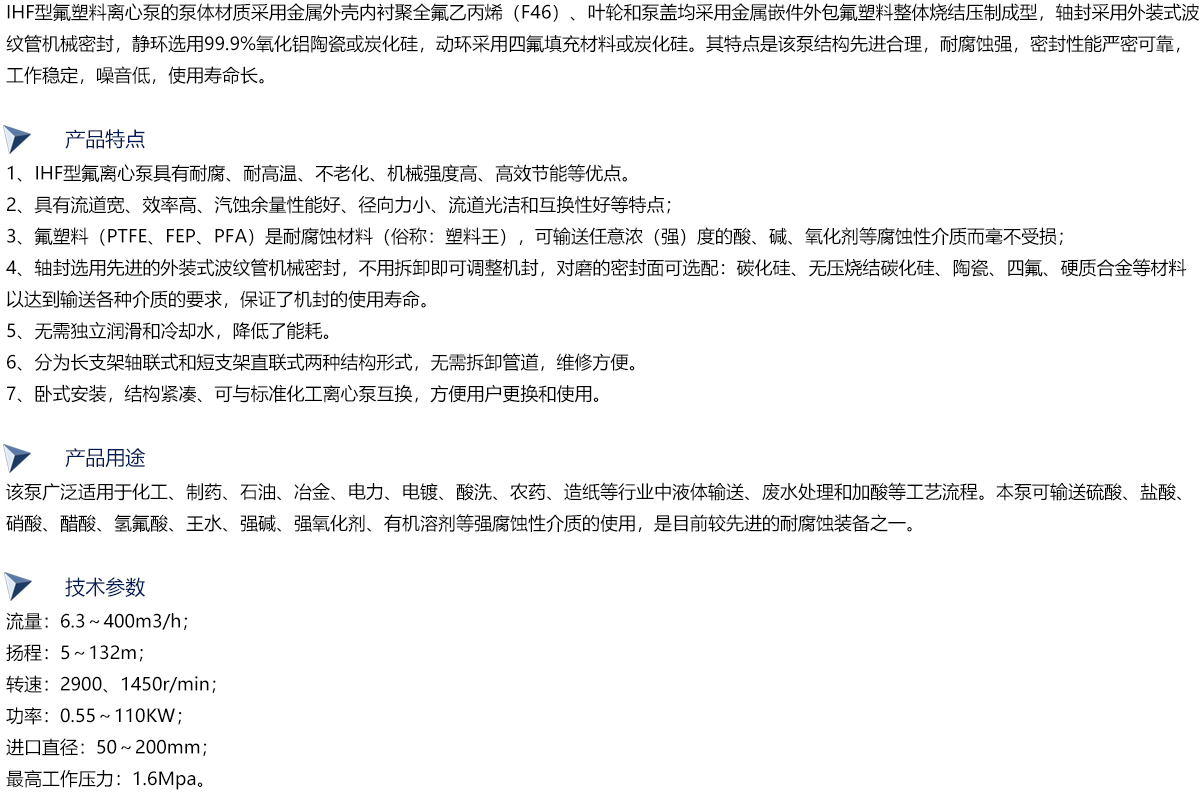 IHF型泵为单级单吸式氟塑料合金化工离心泵,是按国际标准设计并结合非金属泵的加工工艺设计生产的,该泵具有耐腐、耐磨、耐高温、不老化、机械强度高、无毒素分解、使用温度宽,输送介质温度为-85℃-200℃等优点。