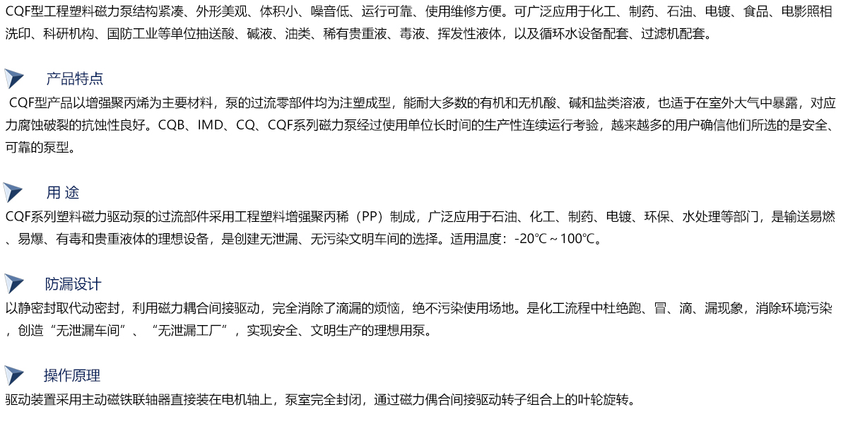 CQF型磁力驱动泵(简称磁力泵)是将永磁联轴器的工作原理用于离心泵的新产品,设计合理,工艺先进,具有全密封,无泄漏,耐腐蚀的特点,其性能达到国外同类产品的先进水平。