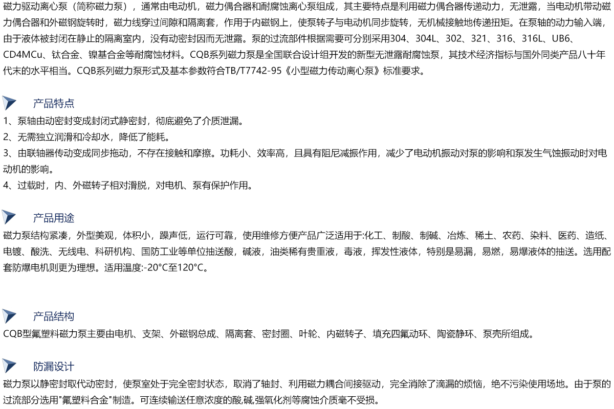 CQB系列磁力泵是磁力泵全国联合设计组开发的新型无泄漏耐腐蚀泵,其技术经济指标与国外同类产品八十年代末的水平相当。
