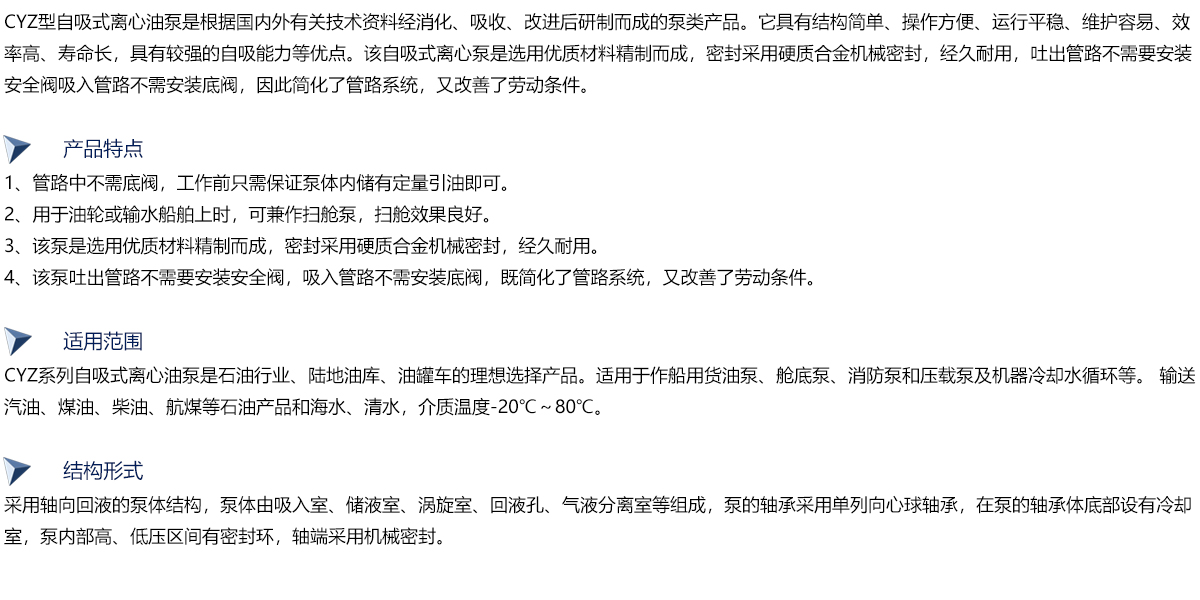 该泵既具有结构简单、操作方便、运行平稳、维护容易、排量大、效率高、噪声低、寿命长等优点,又具有较强的自吸能力,吸入管路中不需安装底阀,因此既简化了管路系统,又改善了劳动条件。是石油行业、陆地油库、油罐车的理想产品,并适用于作船用货油泵、舱底泵等,分别可以用来输送汽油、煤油、柴油、航煤等石油产品和海水,介质温度-20~80℃。