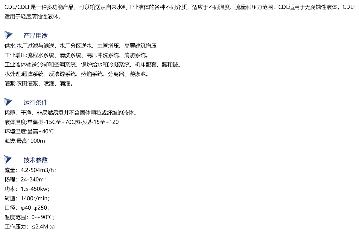 CDL/CDLF为安装标准电机的非自吸式多级离心泵,电机轴通过泵头用轴联器直接与泵轴连接,拉杆螺栓将耐压筒、过流部件固定在泵头和进出水段之间,泵进出水口在泵底同一直线上;本泵可根据需要配置智能保护器,对泵干转、缺相、过载等进行有效保护。