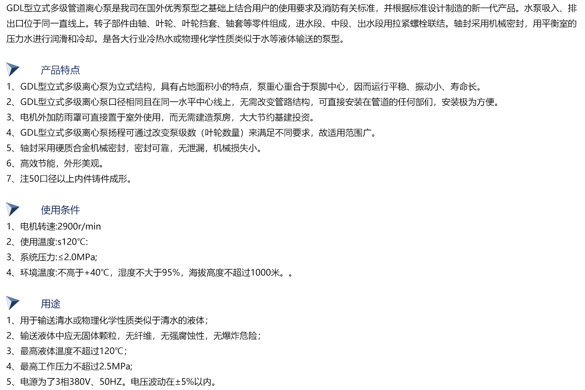 该泵具有节能显著,占地面积小,安装方便,性能稳定等特点。外套采用1Cr18Ni9Ti优质不锈钢,轴封用耐磨机械密封,无泄漏,使用寿命长。以水力平衡解决轴向力,因而泵运转平稳,低噪音,安装条件优于DL型泵,可以简便安装任一段水平管路中间。能满足高层建筑、深井矿等的给排水及消防设施需要,是广大冷热水行业或一般介质、理化性质类似水等液体输送的泵型。