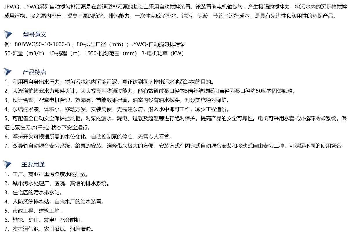 JYWQ型自动搅匀潜水排污泵是本司在吸收国外先进技术的基础上,采用水力模型开发研制而成的新型环保类产品,在排送固体颗粒和长纤维垃圾以及减少污水坑内沉积等方面,具有独特功能。