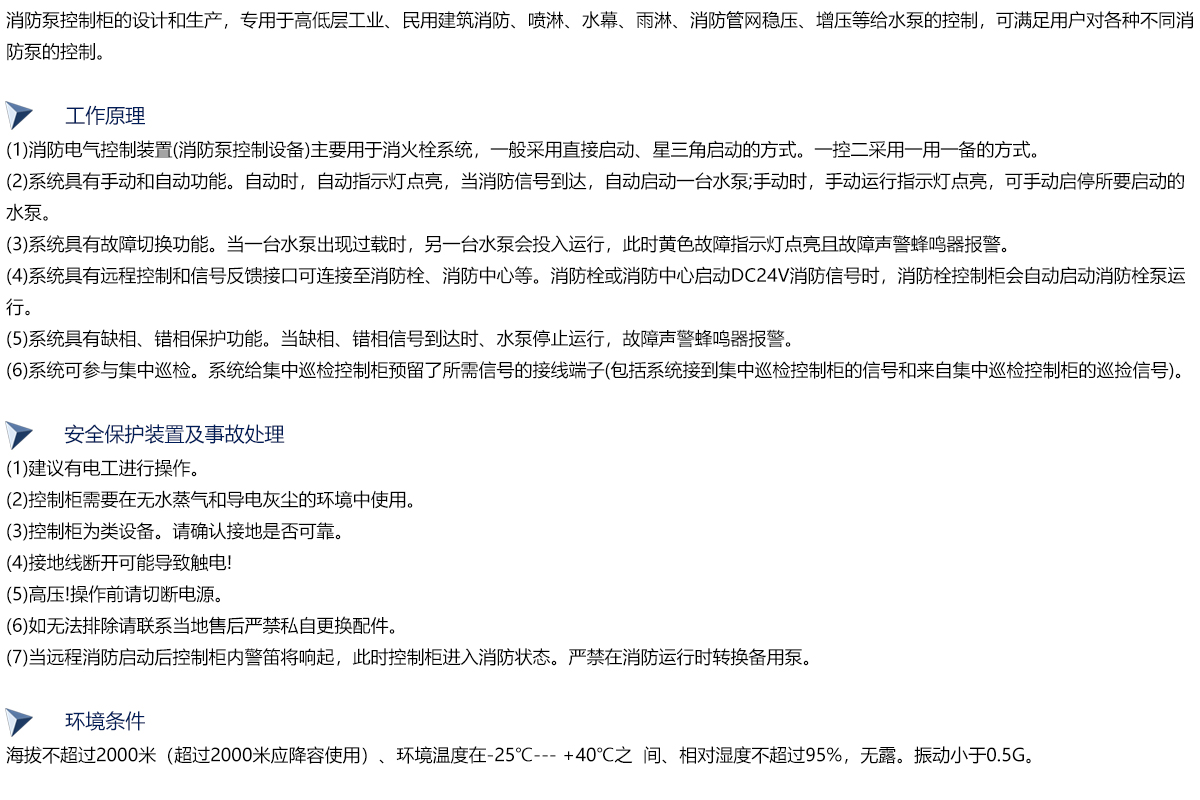 此系列全自动变频控制柜是我公司吸收国内外水泵控制的先进经验,经过多年生产和应用,不断完善优化后,精心设计制作而成。变频控制柜具有过载、短路、缺相保护以及泵体漏水,电机超温及漏电等多种保护功能及齐全的状态显示,并具备单泵及多泵控制工作模式,多种主备泵切换方式及各类起动方式。可广泛适用于工农业生产及各类建筑的给水、排水、消防、喷淋管网增压以及暖通空调冷热水循环等多种场合的自动控制。水泵控制柜内在质量优良,外形美观耐用,安装操作方便,是各类水泵安全可靠的伴侣。